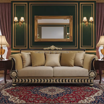 סט ספה קלאסי אלגנטיות | בד בז 'מפואר עם גילופים זהב לחדרי מגורים מלכותיים