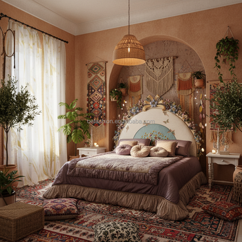 מיטה בסגנון בוהמיאן עם אוזניות פרחונית, מקראמה עבור חדר שינה נעים